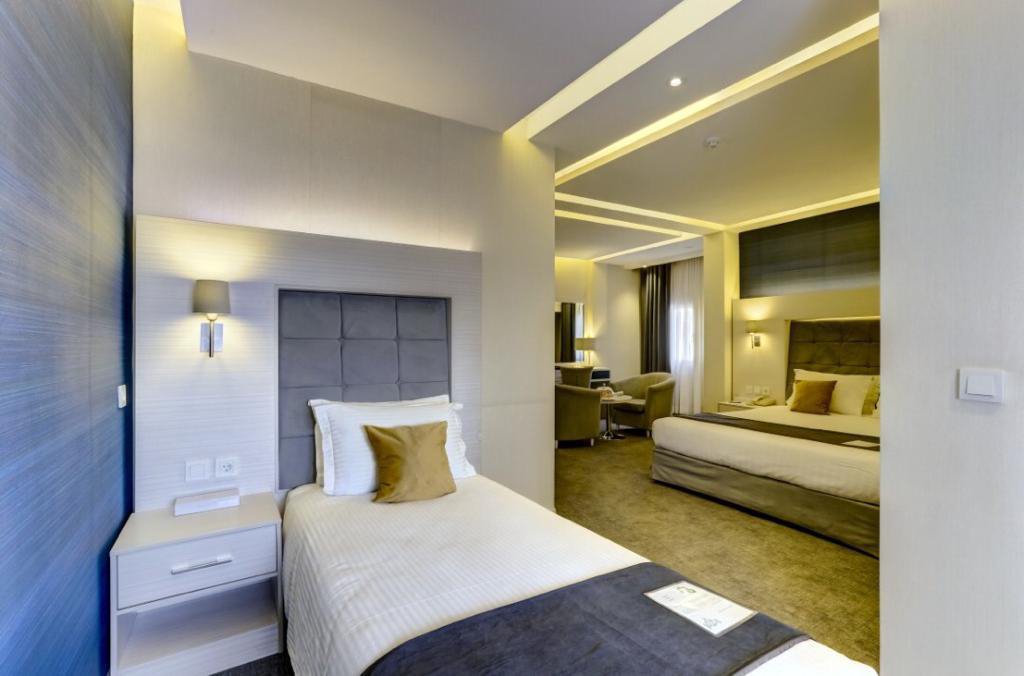 فضای نشیمن: بعضی از اتاقهای هتل (سوئیتها) دارای فضای نشیمن مجزا هستند که با مبلمان لوکس و دکوراسیون زیبا، مکانی مناسب برای استراحت و گذراندن وقت را فراهم میکند. این فضا برای مطالعه، تماشای تلویزیون یا صرف یک فنجان قهوه در محیطی آرامشبخش بسیار ایدهآل است.